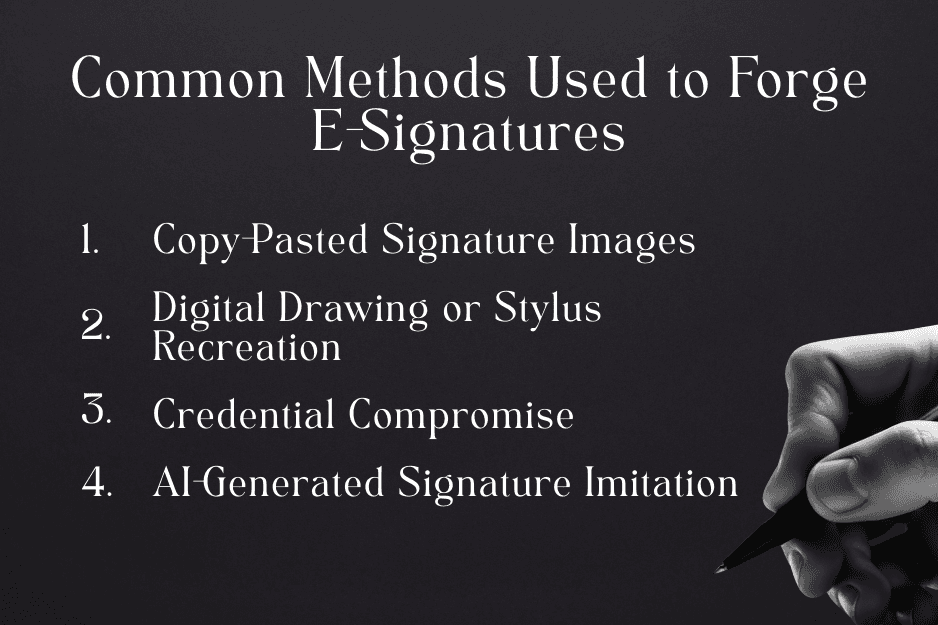 Most e-signature forgery attempts rely on unauthorized access or reused signature images rather than sophisticated technical attacks. These methods exploit weak identity verification and user behavior, not failures in cryptographic systems. As a result, disputes usually center on access control rather than signature appearance.