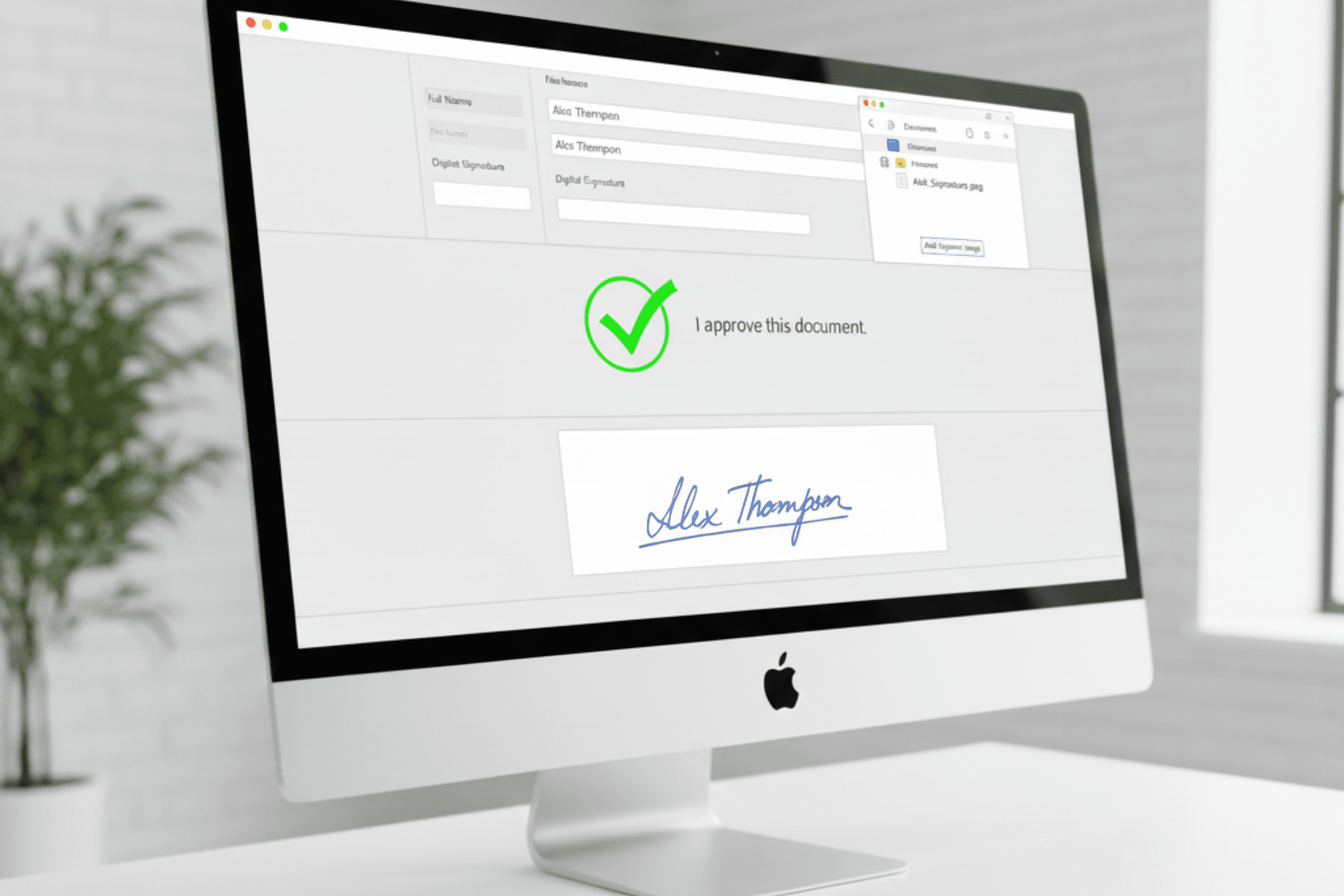 An electronic signature is any electronic action that indicates agreement to a document. This can include typing a name into a signature field, clicking an approval checkbox, drawing a signature on a touchscreen, or attaching an image of a handwritten signature.